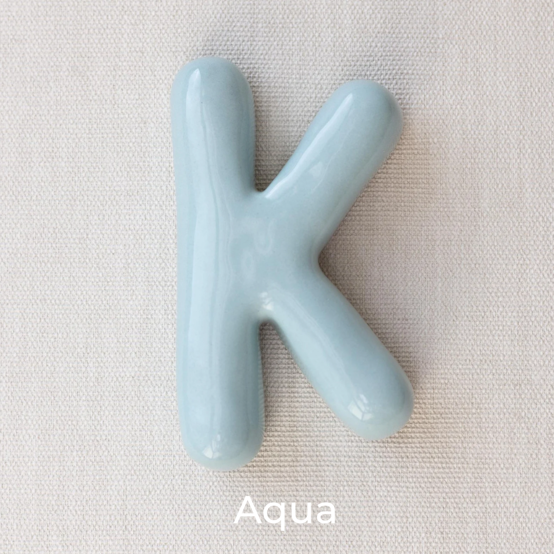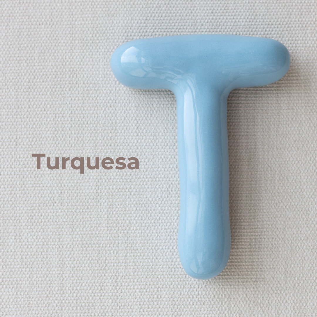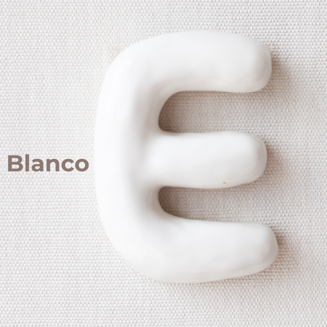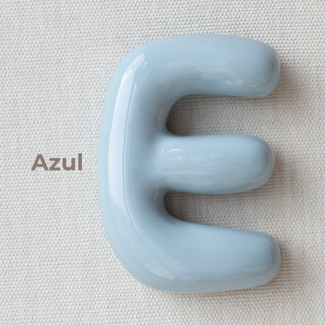 Letras de cerámica esmaltadas a mano en acabado brillante. Cada una está diseñada para ser colgada en la pared, tiene una perforación en la parte posterior para facilitar su instalación. Se venden por separado. Disponibles en varios colores.