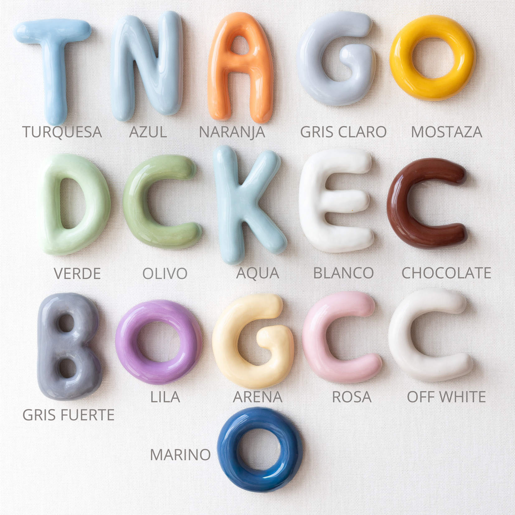 Letras de cerámica esmaltadas a mano en acabado brillante. Cada una está diseñada para ser colgada en la pared, tiene una perforación en la parte posterior para facilitar su instalación. Se venden por separado. Disponibles en varios colores.
